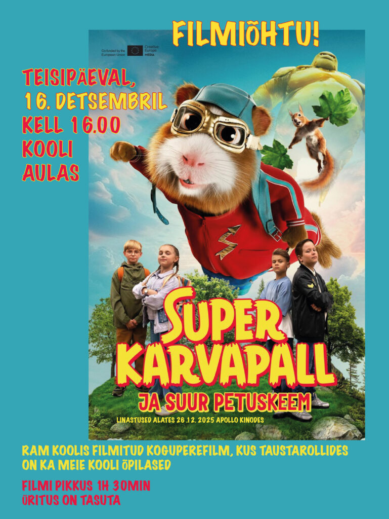 Teisipäeval, 16. detsembril kell 16.00 on kõigil võimalus tulla kooli aulasse vaatama uhiuut koguperefilmi „Super-Karvapall ja suur petuskeem“, mis on filmitud just meie koolis!